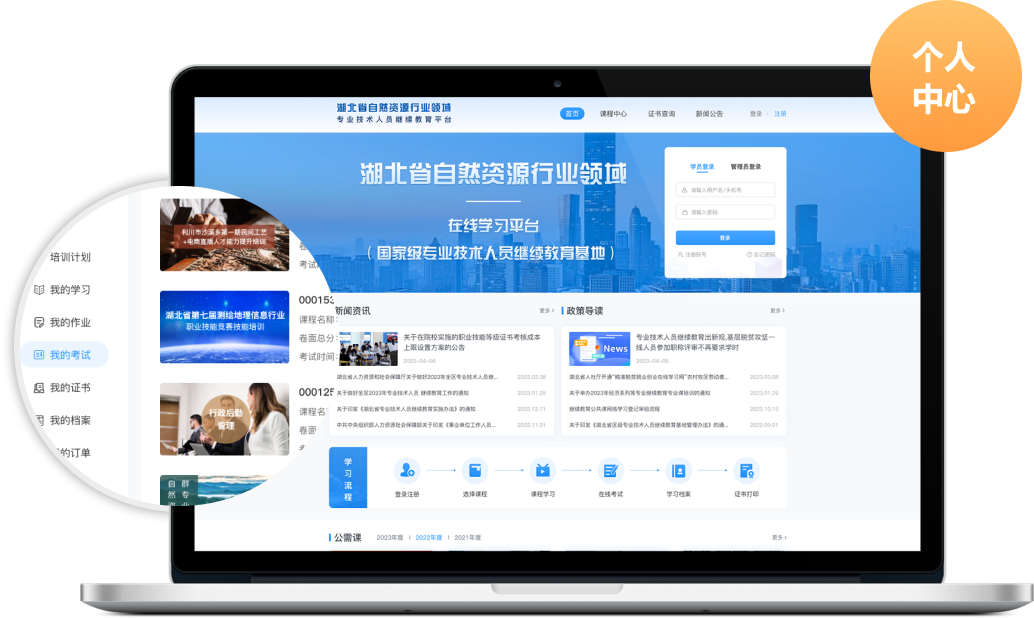 平台门户主要包括首页、课程中心、证书查询、新闻公告,学员注册登录、课程试看,报名选课、缴费和学员个人中心等模块,支持在线选课缴费、考试、结业申请等功能